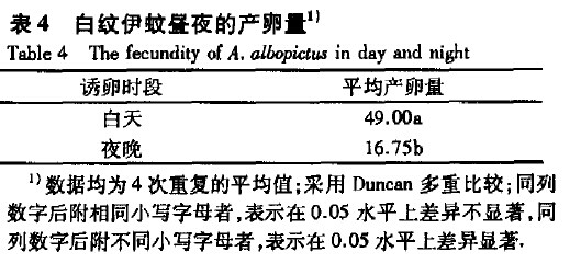 2.1.4昼夜对白纹伊蚊产卵量的影响结果《表4)表明,白纹伊蚊以白天产卵为主。说明光照对产卵有一定影响,其产卵量与成蚊密度一致[6]。