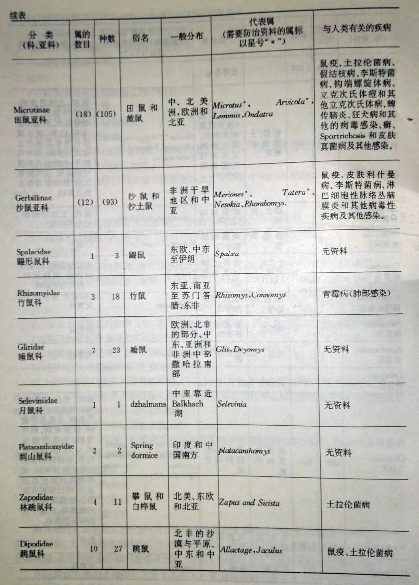 能由啮齿动物传播的疾病太多,很难对创门全都加以叙述或讨论,或者描述它们的临床征象。所以我将选择很可能发生在这个地理区域的一些疾病为例。各种类型的病原体都有。我 很高兴其他演讲者已关心到病毒性和寄生虫性疾病,因此我将主要地谈及细菌性疾病。不管怎样,我这篇文章附有摘自世界卫生组织(W.H.O)1974年技术报告丛书553的一张表,标明啮 齿动物的科、属和种的数目,分布,代表性的属,以及与人类有关的疾病。它以权威性的参考资 料为依据,但不是包罗万象的。事实上,我很乐意推荐W.H.0.另外一部关于寄生虫性的动物传染病的报告丛书(637,1979年)。虽然原虫和蠕虫感染主要涉及兽医公共卫生上有重要意义的动物传染病,但也提到了起源于啮齿动物的寄生虫性动物传染病。